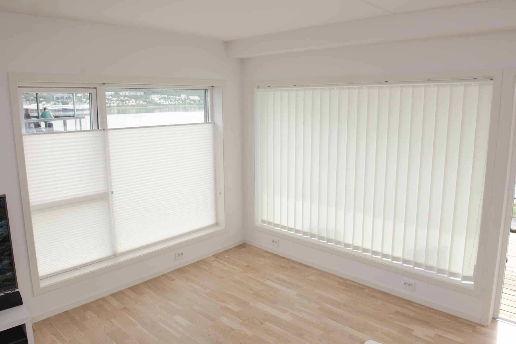 2 x plisségardiner med snorbetjening – dækker op til 4,6 meter.