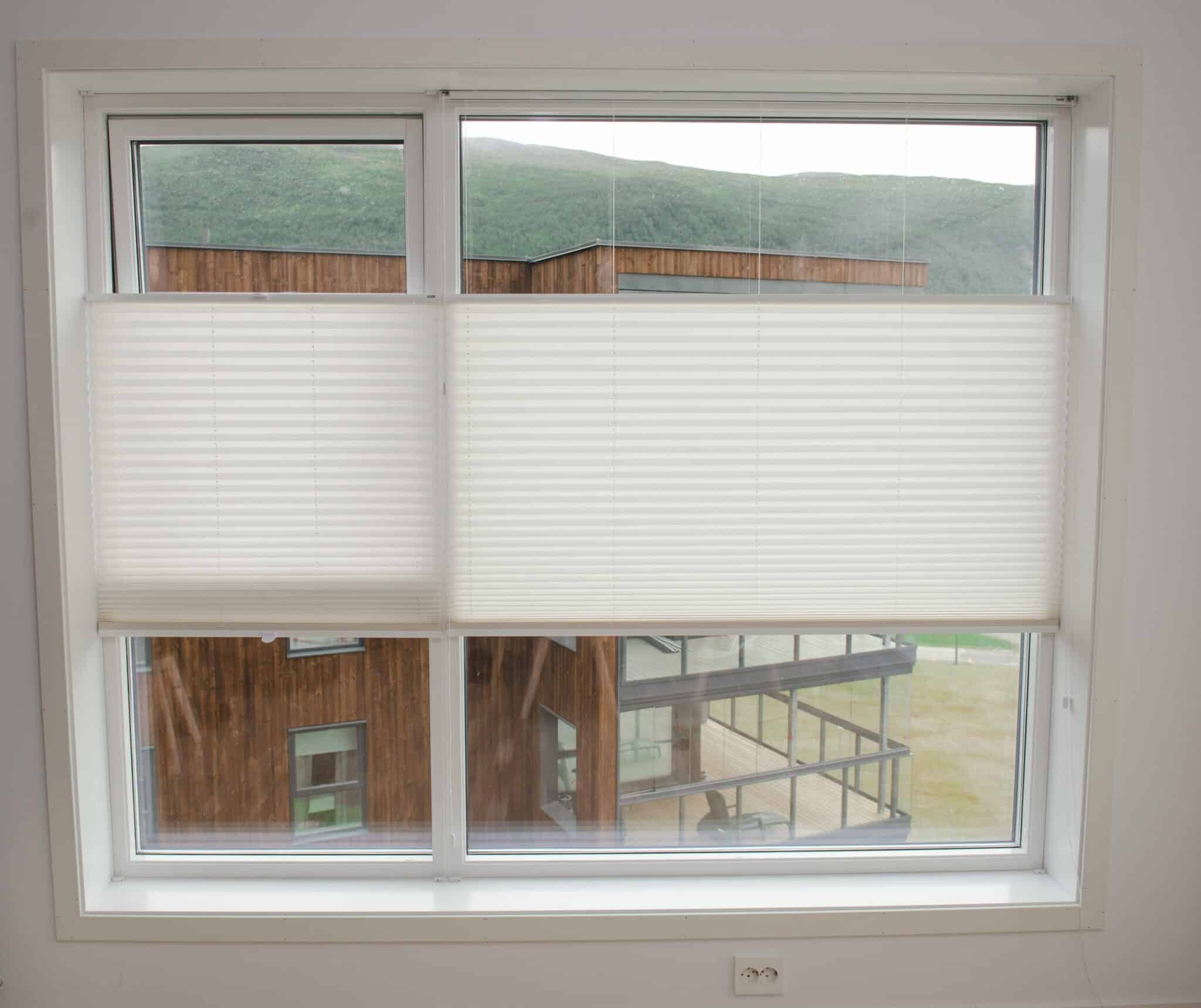 2 x plisségardiner med grebsbetjening – op og ned – dækker op til 3 meter.
