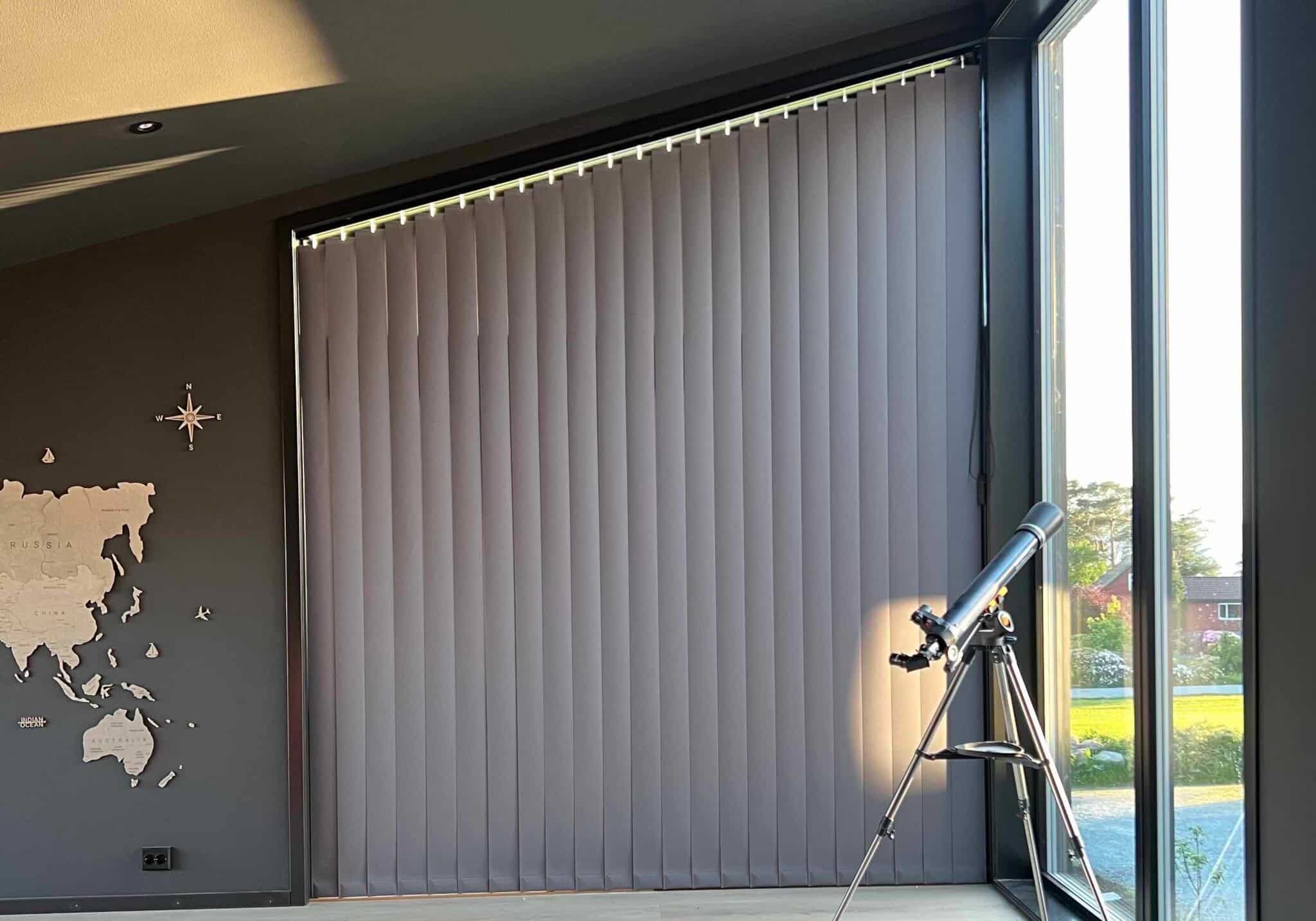 Vertikale lamelgardiner er den ideelle løsning til store skråvinduer. De er et elegant valg og tilbyder fremragende lyskontrol. Med mørklægningsstof kan du nyde dine yndlingsfilm under optimale forhold.