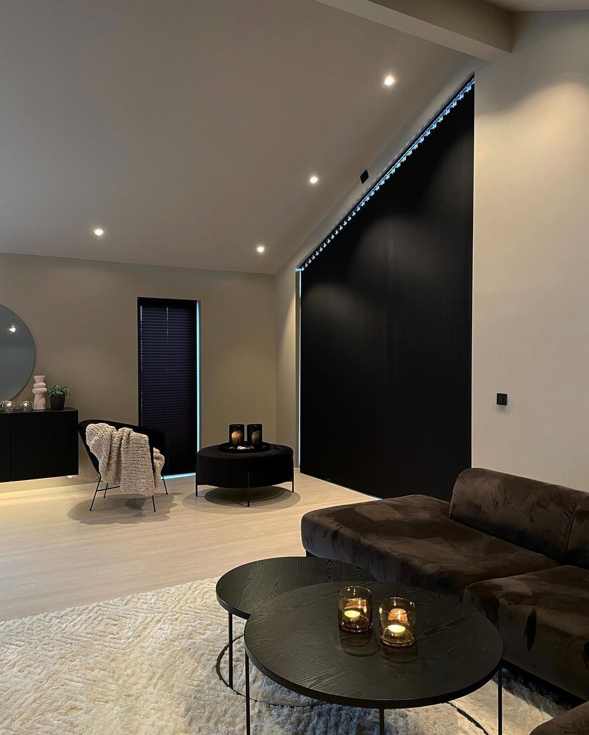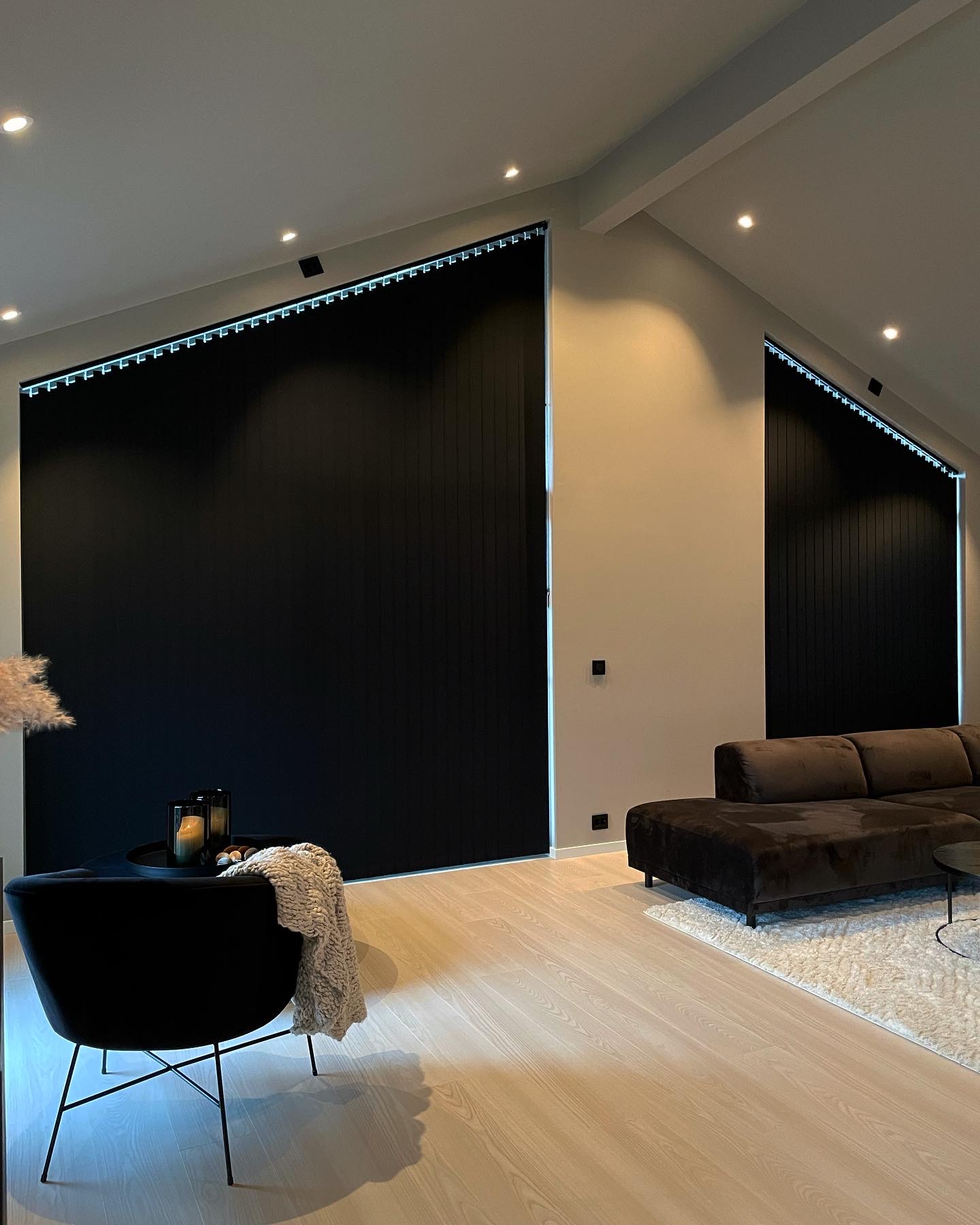 Et virkelig flot resultat med smukke vertikale linjer, der skaber et elegant udtryk i rummet. Kunden beskriver resultatet som perfekt. Lamelgardinet giver dig ekstra god kontrol over indkig og lysindfald, samtidig med at det er en stilfuld del af indretningen. De vendbare lameller gør det nemt at styre graden af privatliv, uden at det føles indelukket, når gardinet er lukket. Produkt: Lamelgardin til skråvindue – 89 mm Tekstilnummer 210005
