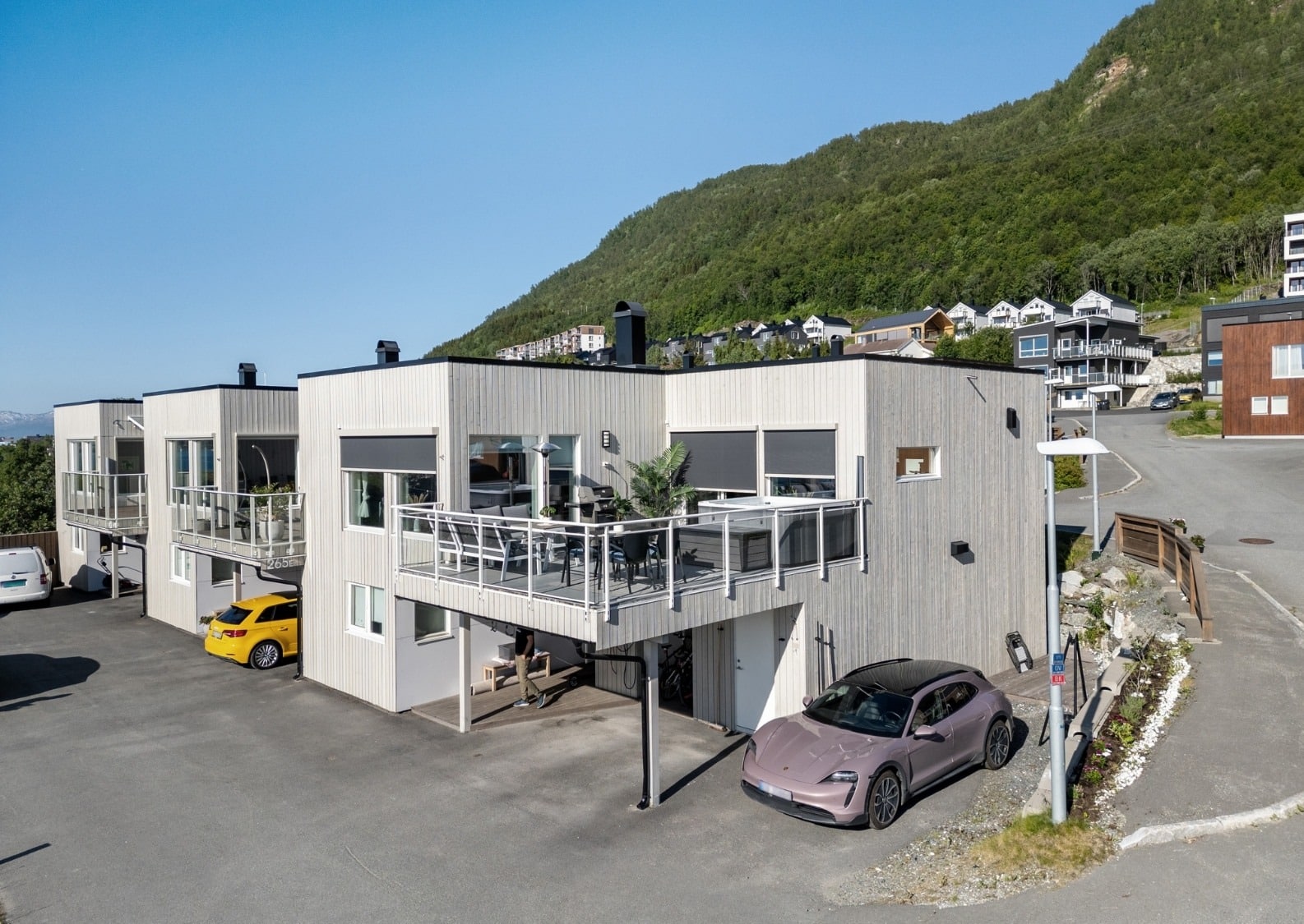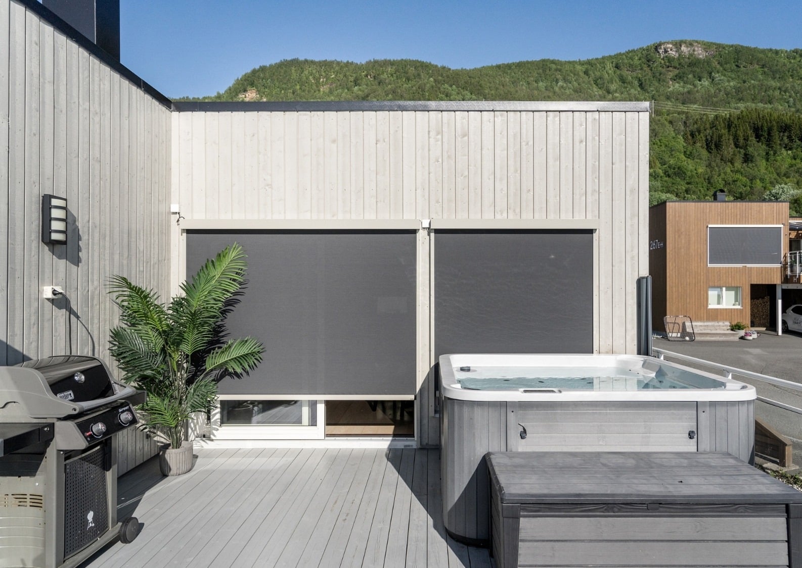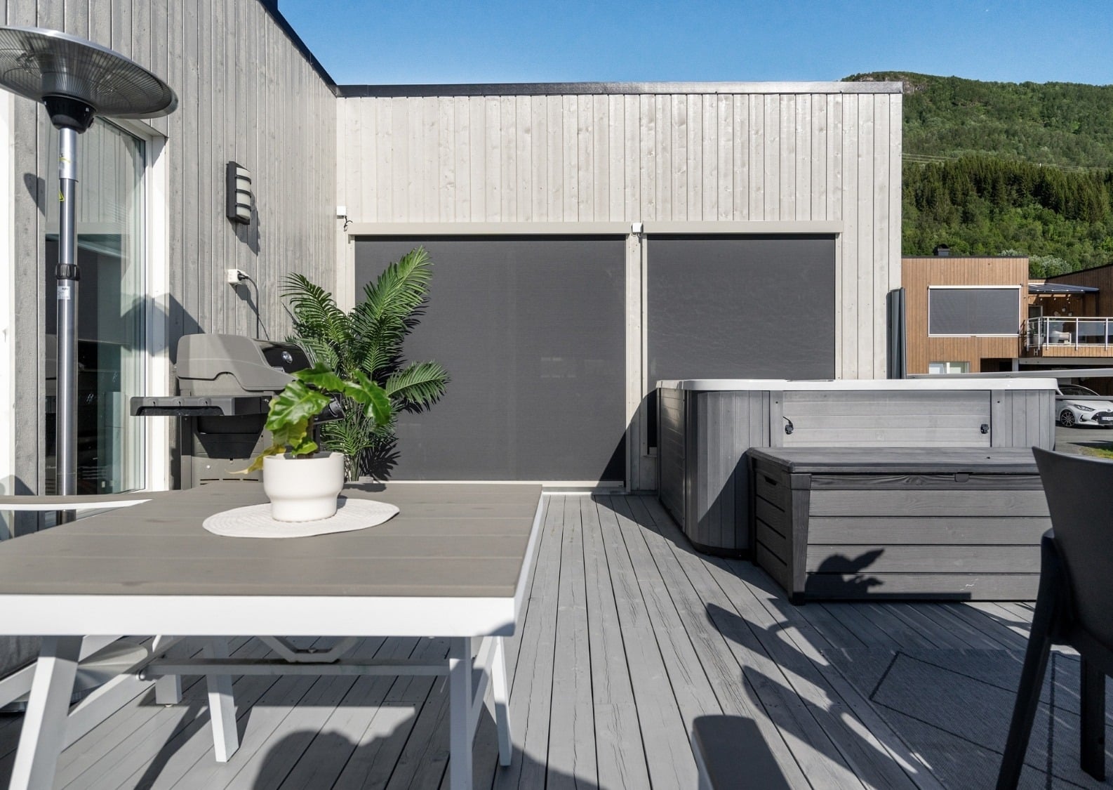 Når detaljerne tæller, vælger du løsninger, der både beskytter og fremhæver dit hjem. Denne Zipscreen-løsning – i firkantet design, mørkegrå/sort dug og RAL7032 (sten-grå) – er et perfekt eksempel på, hvordan funktion og arkitektur kan spille sammen. Løsningen glider sømløst ind i facaden og kombinerer stram æstetik med maksimal funktion.